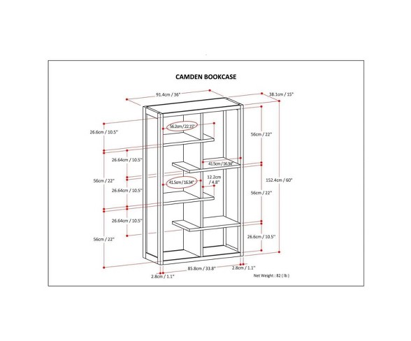 Description A contemporary statement piece for the any living room or home office. The Benson Bookcase offers ample storage with great modern style. The four solid wood shelves offer a fresh way to show off favorite books or decorative objects. The bookcase would make a great room divider in an open space and the perfect piece for your on-trend environment. Efforts are made to reproduce accurate colors, variations in color may occur due to computer monitor and photography. Features: Rectangle (shape)Dimensions (Overall): 60 inches (H) x 36 inches (W) x 15 inches (D)Material: Hardwood, Pine (Frame)Finish: StainedWeight: 82 poundsAccessories Included: Assembly Instructions, anti-tip anchoring hardwareFeatures: Fixed Shelves, Open ShelvesAssembly Details: Adult assembly required, tools not providedSafety and Security Features: Anti-tip anchoring hardwareNumber of Shelves: 4Primary item stored: Books, universal storageHolds up to: 55 poundsCare & Cleaning: Spot or wipe cleanFinished with a stain and a protective NC lacquer coatingHandcrafted with solid woodFeatures four (4) solid wood unique shelves that offer plenty of storageCan be used as a room divider in an open spaceAvailable in Medium Auburn Brown, Natural Aged Brown and Dark Chestnut Brown Estimated shipping dimensions: 17.72INCH X 9.06INCH X 62.8INCH DPCI : 249-14-5448 UPC : 840469036239 TCIN : 53609746 Estimated shippimg weight: 92.59POUND