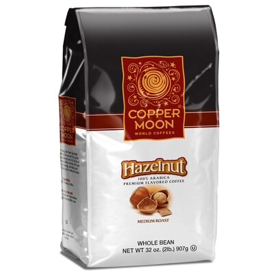 Description A hazelnut flavored coffee. Hazelnut Flavor A Great Tasting Coffee Medium roasted to perfection Great hot or over Ice Specifications Capacity (oz.) : 32 Flavoring : Hazelnut Coffee Type : Beans USDA Certification : No USDA Organic Certification Coffee Roast : Medium Caffeinated or Decaf : Caffeinated Fair Trade Certified : No Organic : No Kosher : Yes Brand : Copper Moon Coffee Customizable : No Weight : 2.00 lbs. per Each