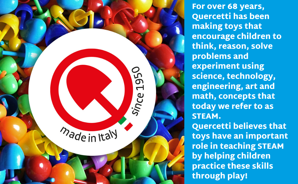 The Quercetti Kaleido Gears 55-piece building set features 3 sizes of interlocking gears and plates that create captivating spinning designs. Designed for children aged 3-7, it promotes STEM skills, creativity, and fine motor development through hands-on play without batteries. This versatile set includes 6 large gears with kaleidoscopic stickers, 22 axles, a manual crank, and 16 interlocking plates for endless 3D construction fun.