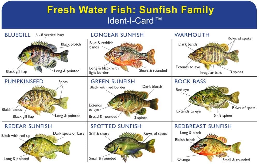 The Express Yourself Sunfish Family Ident-I-Card is a waterproof, pocket-sized identification card featuring full-color, accurate illustrations of freshwater fish. Field-tested for durability, it's the ideal gift for fishing lovers and proudly made in the USA.
