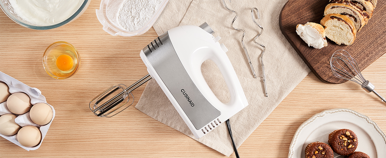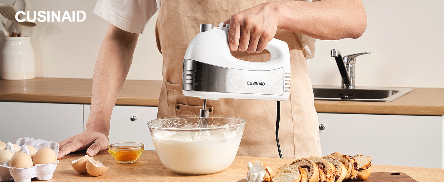 The Cusinaid 5-Speed Hand Mixer is a powerful kitchen tool featuring a 250W motor, five variable speed settings, and a turbo button for efficient mixing. Its ergonomic design includes a one-button eject for easy beater changes and wider stainless steel dual beaters that are dishwasher safe. The stylish stainless steel surface and snap-on storage case make it a practical addition to any modern kitchen.