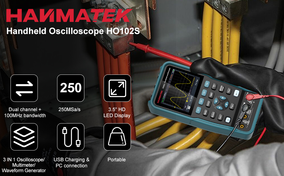 The HANMATEK HO102S is a professional-grade 3-in-1 handheld oscilloscope, multimeter, and waveform generator, featuring a 100MHz bandwidth, 10,000 wfms/s refresh rate, and a 3.5-inch color display. With deep storage capabilities and multiple automatic measurement functions, it is designed for accuracy and ease of use, making it perfect for engineers, students, and technicians alike.