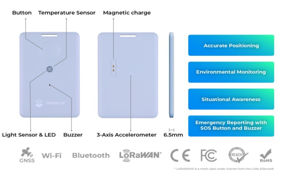 The Seeed Studio T1000-A is a sleek, credit card-sized GPS tracker combining multi-constellation GNSS, BLE, Wi-Fi, and LoRaWAN for precise indoor/outdoor positioning. Equipped with temperature, light, and motion sensors plus an SOS panic button and buzzer, it ensures real-time monitoring and emergency alerts. Its IP65 waterproof design and magnetic charging support months of reliable use in harsh conditions, making it ideal for logistics, asset protection, and safety-critical applications.